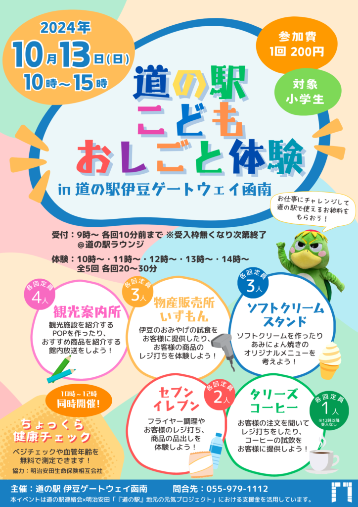 小学生のお子様を対象に、道の駅各店舗のおしごとが体験できるイベントを開催します。