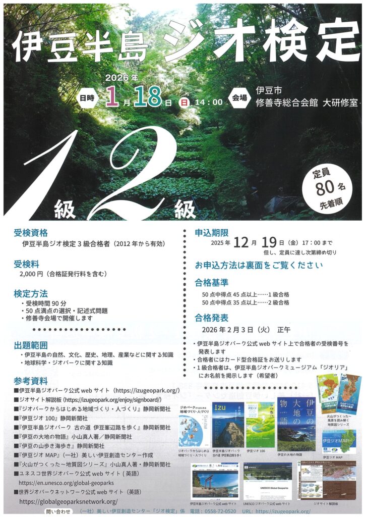 1級合格者はジオリアにネームプレートが掲出されます! 来年1月18日(日)にジオ上級検定を実施します。より高度で幅広いジオパークの知識を試すもので、ジオ検定3級合格者(のべ7,600人)が受験することができます。 得点に応じて1級及び2級に認定し、... -