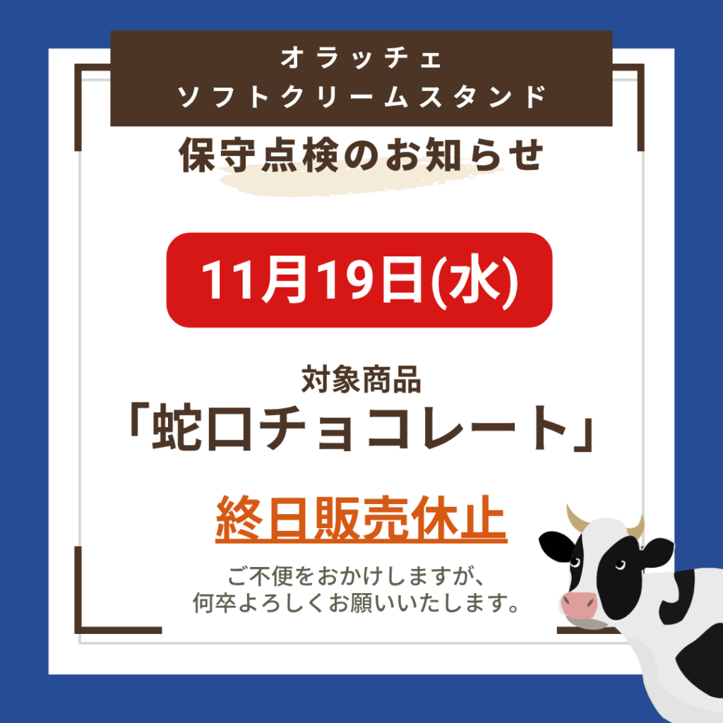 【オラッチェソフトクリームスタンド】11/19(水)設備点検に伴う販売休止について