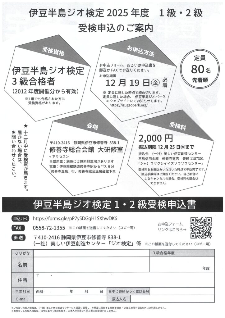 | ホームページ | 伊豆半島ジオパーク https://izugeopark.org/2025/11/28/geokentei-3/?post_id=34252 ※検定の詳細についてはチラシやリンク先ホームページ等をご参照ください |