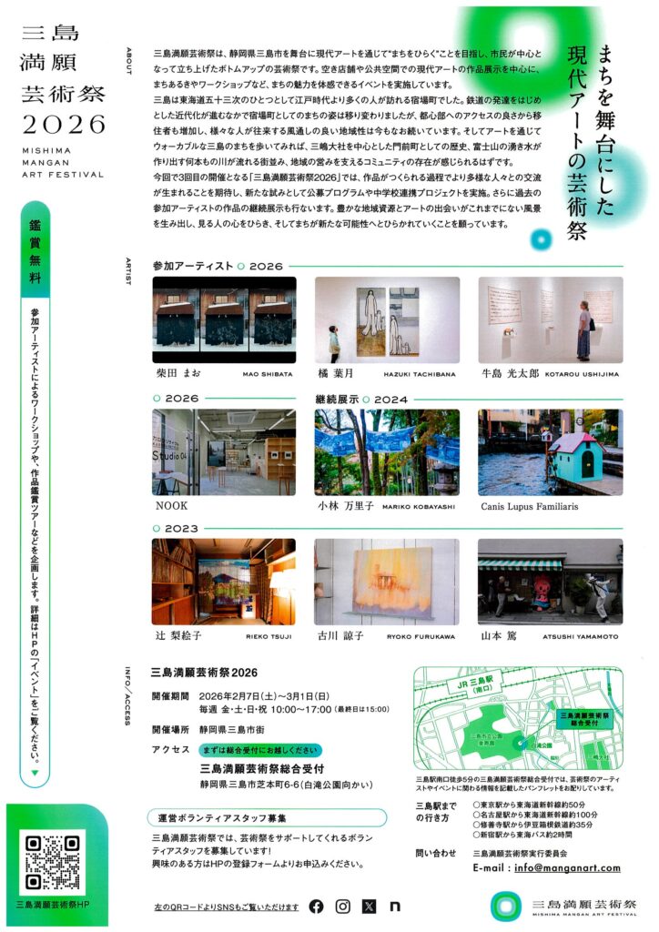今回で3 回目の開催となる「三島満願芸術祭 2026」では、 作品がつくられる過程でより多様な人々との交流が生まれることを期待し、新たな試みとして公募プログラムや中学校連携プ ロジェクトを実施。さらに過去の参加アーティストの作品の継続展示も行ないます。豊かな地域資源とアートの出会いがこれまでにない風景を生み出し、見る人の心をひらき、そしてまちが新たな可能性へとひらかれていくことを願っています。