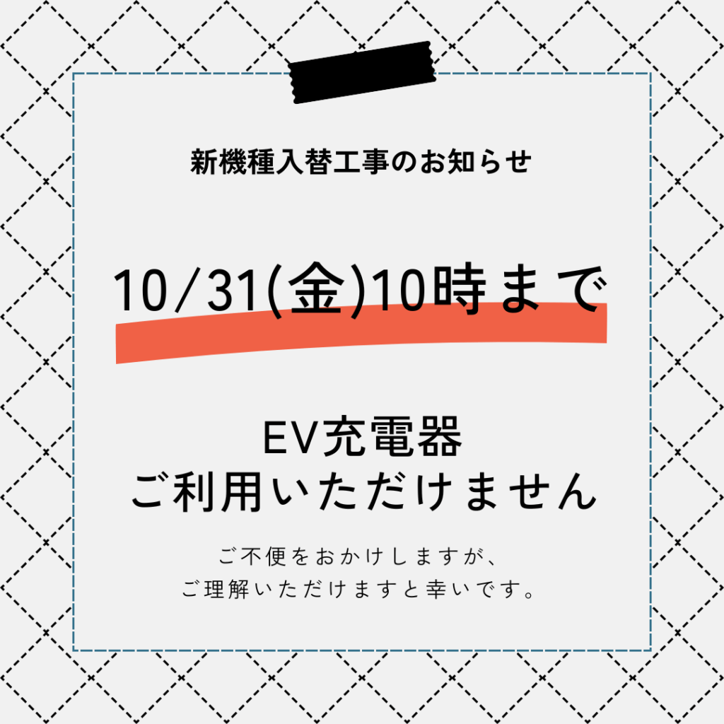 EV充電器の新機種入替工事およびメンテナンスに伴い、下記の期間中はEV充電器をご利用いただけません。