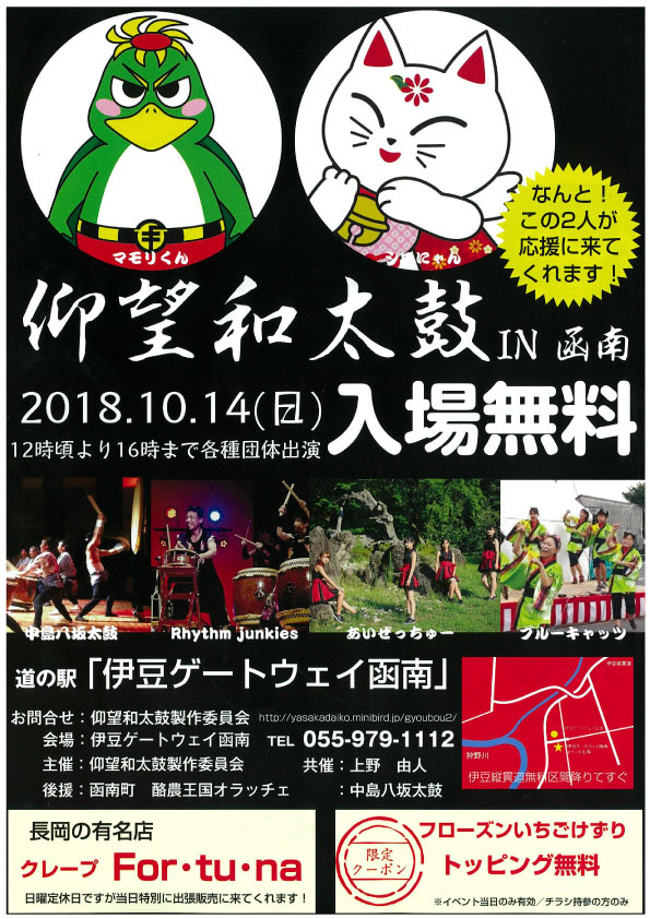 静岡県東部を拠点に20余年にわたり活動を続ける中島八坂太鼓をはじめとする4つのバラエティ豊かなパフォーマンスをお楽しみいただけるプログラム。中島八坂太鼓のほか、打楽器集団Rhythm Junkies、”ほぼオールプロデュースユニット”伊豆半島で活躍中のダンス&ボーカルユニットあいぜっちゅー、かんなみ猫おどり実行委員会公認チーム「ブルーキャッツ」が出演。長岡の有名クレープ店「クレープFor・tu・na」の特別出張販売もあります。
