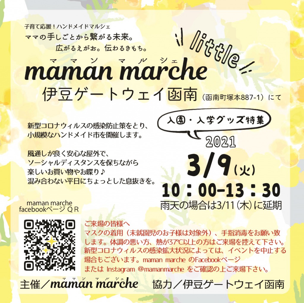 2月から振替!今回は入園・入学グッズ特集です☆ 会場:自由通路・イベント広場 10時〜13時(雨天の場合11日に振替) 子育て世代の交流と応援を目的に活動する静岡県東部最大級のママ作家グループ「ママンマルシェ」のハンドメ …