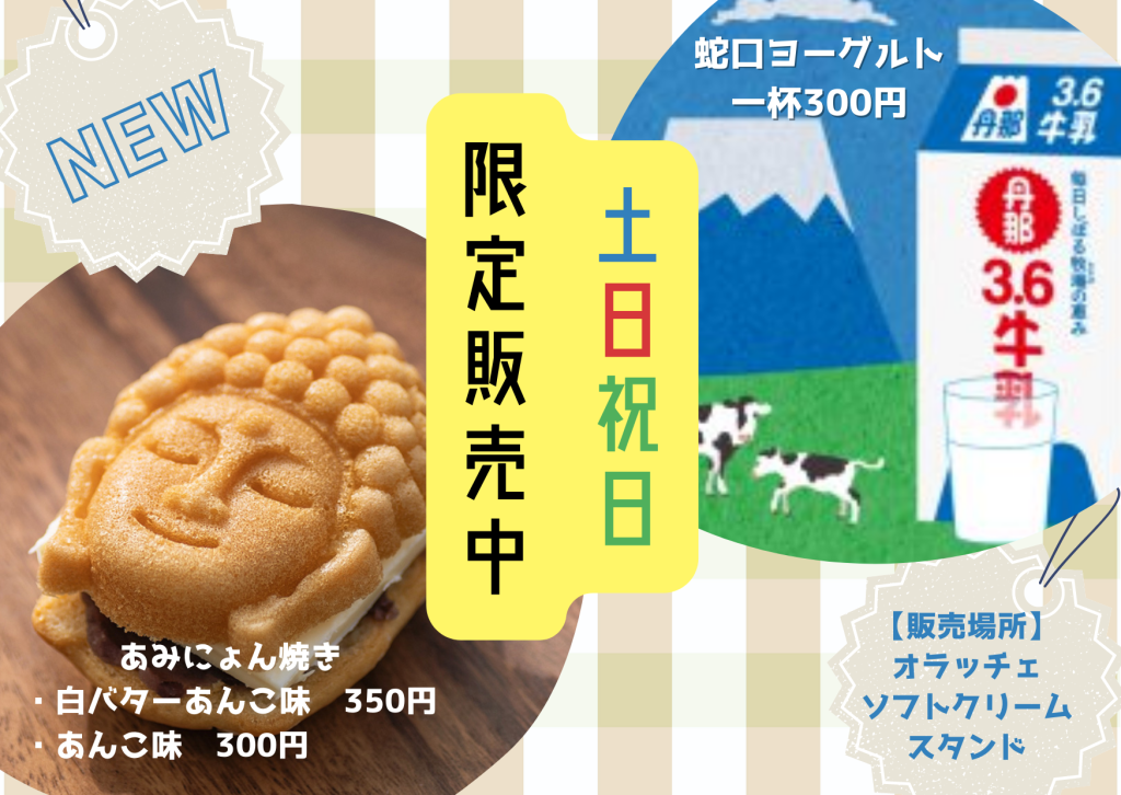 10:00~ なくなり次第終了 @オラッチェソフトクリームスタンド 【蛇口ヨーグルト】一杯¥300- 函南の名物「丹那牛乳」を使って作られた、おいしい飲むヨーグルトが出てくる巨大牛乳パックモニュメント! ソフトクリームス …