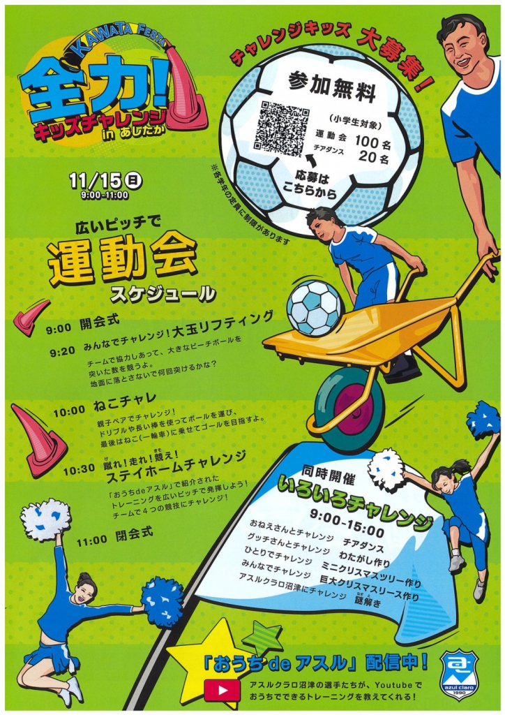 日本プロサッカーリーグに加盟し、沼津をホームタウンに活躍するチーム『アスルクラロ沼津』の試合前に広いピッチで運動会を行います!